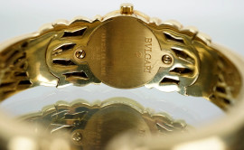 Bulgari Antalya, orologio da polso in oro giallo 18 kt, cassa tonda cm 2, quadrante nero, bracciale in oro giallo con ricambi in pelle nelle tonalità del rosso, verde, blu, cammello e nero. Peso gr. 76,7.