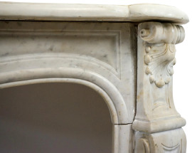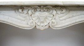 Camino Luigi XV in marmo bianco, fine XIX-inizi XX secolo, piano sagomato con decoro fogliaceo centrale sottofascia, montanti laterali mossi lavorati come paraste scanalate desinenti a foglie d'acanto sulla sommità, cm h 130x154x35,5, (difetti)