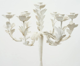 Candelabro a sette fiamme in ferro battuto bianco, tre piedi a ricciolo,cm h 90