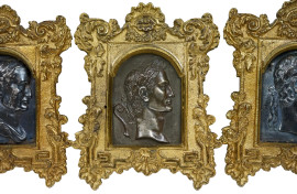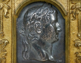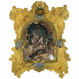 Cinque placche in argento raffiguranti profili di imperatori romani lavorati a sbalzo, cornici in bronzo dorato, misure cadauno cm 10x7, XIX secolo, (lievi segni del tempo)
