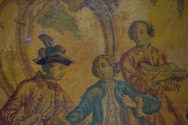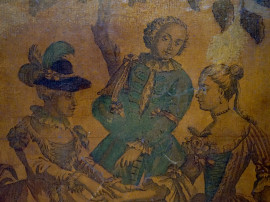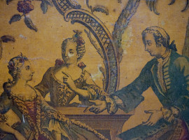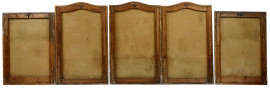 Cinque stampe raffiguranti scene settecentesche, carta applicata su tela, Stamperia Remondini, XVIII secolo, misure max cm 83,5x50,5, in cornici, (difetti).