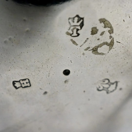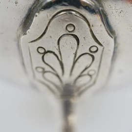 Cioccolatiera in argento, Francia, Lille, XVIII secolo, corpo liscio con presa in legno, poggiante su tre piedini, cm h 22x21, peso lordo gr. 780