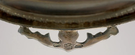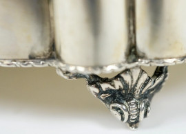 Cofanetto portagioie in argento, Alessandria, seconda metà del XX secolo, coperchio con con castone in pietra verde, decori incisi e sbalzati, piedini cesellati, cm h 7x14,5x12,5, peso gr. 419