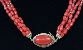 Collana girocollo a quattro fili di corallo, montatura in oro giallo 18 kt, lunghezza cm 43.5