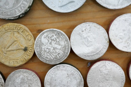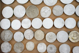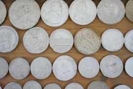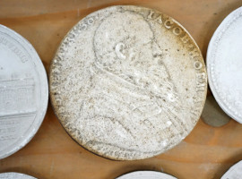 Collezione di 212 calchi in gesso del XIX secolo, raffiguranti medaglie e sigilli, diam max cm 7, (difetti).