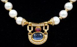 Collier di perle e oro 18 kt con ciondolo impreziosito da brillantini, zaffiro e rubino taglio cabochon, lunghezza cm 47. Entro scatola.