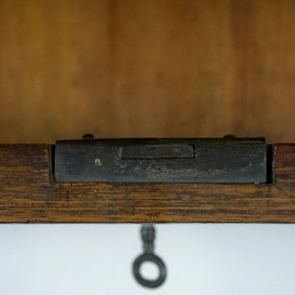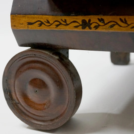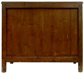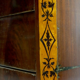 Comò Biedermaier in legno impiallacciato, fronte a quattro cassetti, laterali intarsiati, cm h 101x116x62, (difetti, restauri, parti sostituite).