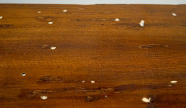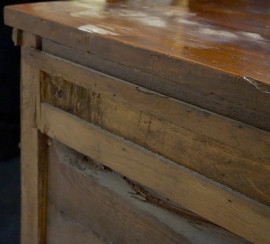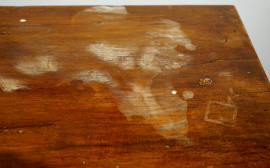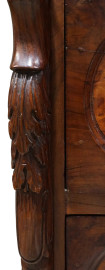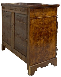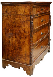 Comò lastronato in noce e radica, XIX secolo, fronte a quattro cassetti, laterali in legno scolpito, grebiale sagomato, cm h 114x119x45, (difetti).