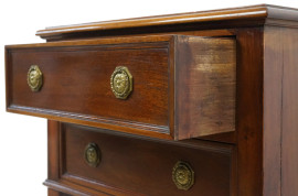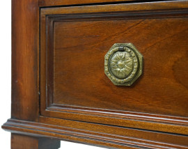 Comodino in mogano, Inghilterra, XX secolo, fronte a due cassetti, quattro gambe troncopiramidali, cm h 76,5x62,5x37, (difetti).
