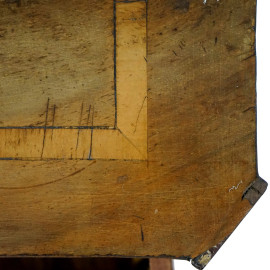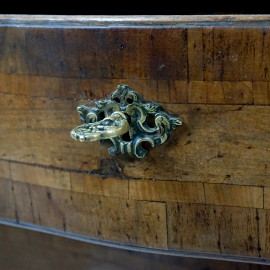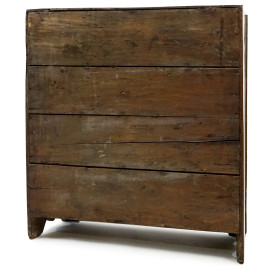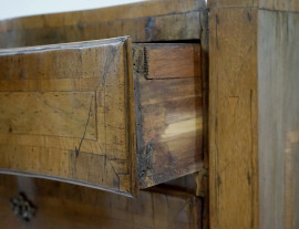 Comodino lastronato, XVIII secolo, fronte di linea mossa a quattro cassetti, piedi a mensola, cm h 80x71x33, (difetti, elementi e parti sostituite).