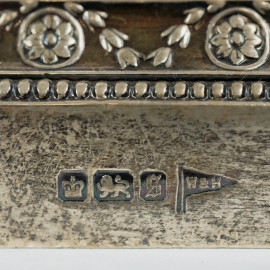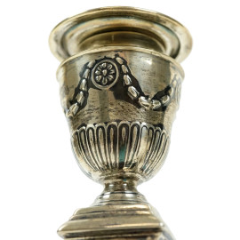 Coppia di candelieri in argento con decori a festoni e ghirlande, città di Sheffield, Walter&Hall, 1910, cm h 21x8,5x9, peso lordo gr. 1180, (appesantiti).