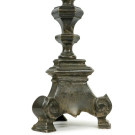 Coppia di candelieri in bronzo, poggianti su tre piedini a ricciolo, cm h 29, (lievi difetti).