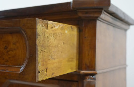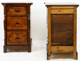 Coppia di comodini in noce e radica, XIX secolo, piano di linea spezzata, fronte a tre cassetti, laterali scolpiti, cm h 84,5x52,5x42, (difetti, elementi sostituiti)