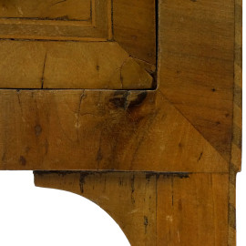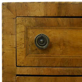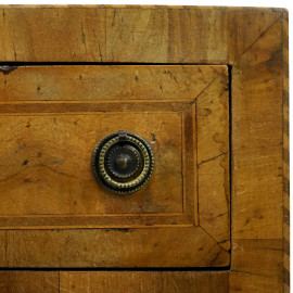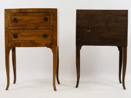 Coppia di comodini lastronati, XX secolo, profili filettati, fronte bombato a due cassettini, quattro gambe mosse, cm h 71,5x47x31, (difetti).