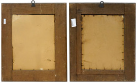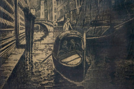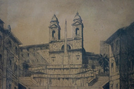 Coppia di cornici in legno intagliato, inizi XX secolo, contenenti due acquaforti raffiguranti il Ponte dei Sospiri e Trinità dei Monti, misure ingombro cm 57x47, misure luce cm 39,5x30,5, (difetti).