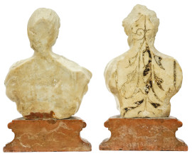 Coppia di eleganti busti in marmo raffiguranti gentildonna e gentiluomo, Toscana, XVIII secolo, misure cadauno cm 32x19x11, (lievi difetti)
