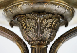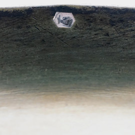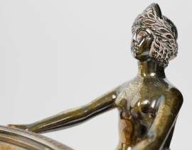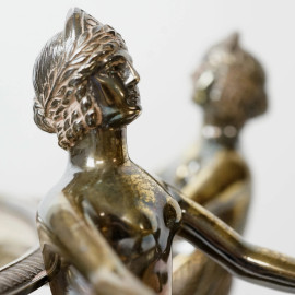 Vaschetta baccellata con prese laterali lavorate a foggia di mezzobusti femminili sinuosi, fusto desinente a motivi fogliacei poggiante su supporto circolare con decori incisi a palmette, quattro piedini a rapace.