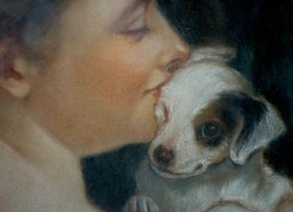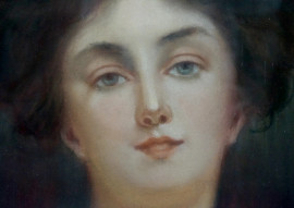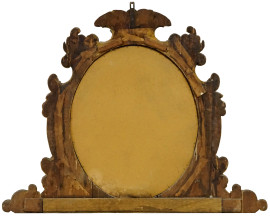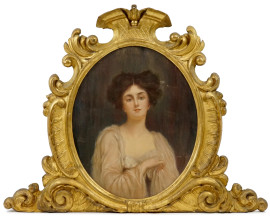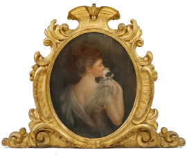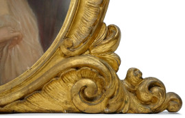Coppia di importanti cornici in legno dorato del XIX secolo, con due pastelli ad assetto ovale raffiguranti nobildonne, intaglio della cornice a foggia di volute e riccioli, misure ingombro cm 108x138, misure luce cm 83x68, (difetti).