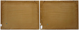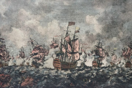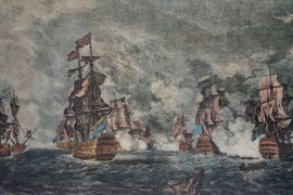 Coppia di stampe a colori raffiguranti battaglie navali francesi, cm 50x63, XX secolo, entro cornici.