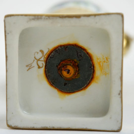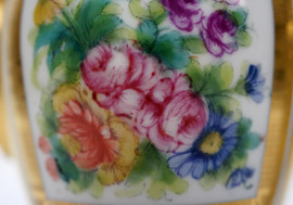 Coppia di vasetti biansati e dorati in porcellana, riserve con decori floreali policromi, prese a foggia di cigni, cm h 16,5, Francia, XIX secolo, marca sotto la base.