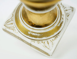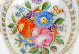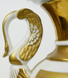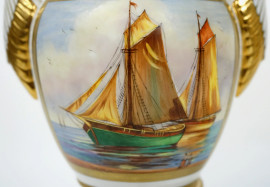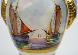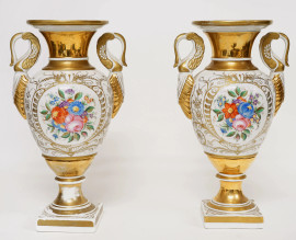 Coppia vasi in porcellana, Francia, XIX secolo, dipinti a mano in policromia e oro, corpi decorati al verso con riserve raffiguranti marine e bouquet di fiori a retro, doppie prese laterali a foggia di cigno, cm h 30, (difetti)