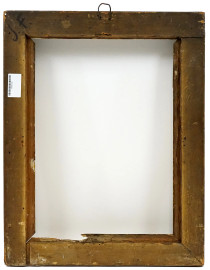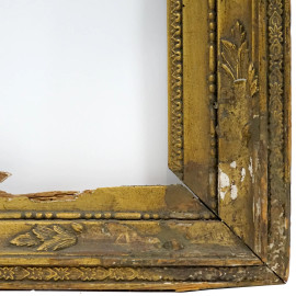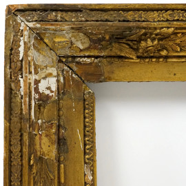 Cornice di linea rettangolare in legno e pastiglia dorata, XIX-XX secolo, battuta interna a palmette, seguita da gola liscia e battuta a fusarola e perle, cadute agli angoli, battuta esterna a motivi floreali, misure ingombro cm 62x49, misure luce cm 50x38, (difetti).