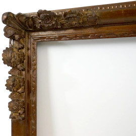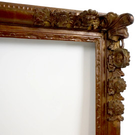 Cornice in legno intagliato, angoli con decori a cadute, inizi XX secolo, misure ingombro cm 123,5x103, misure luce cm 103,5x83, (difetti)