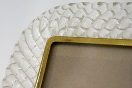 Cornice portafoto in vetro di Murano trasparente, particolari e base in metallo dorato, cm h 24,5x22,5, XX secolo.