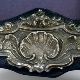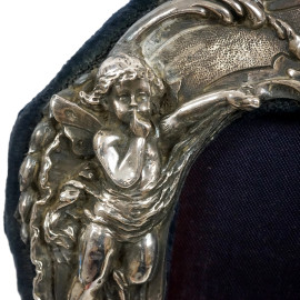 Cornice portafotografia di linea sagomata in argento, M & L S, Londra, seconda metà del XX secolo, decori sbalzati a volute, fiori, puttini e colombelle, cm 32,5x21,5