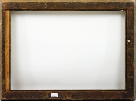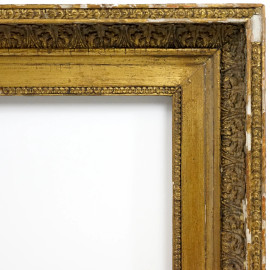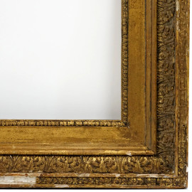 Cornice rettangolare in legno dorato, XIX secolo battuta interna a nastro seguita da gola liscia, decoro a foglie di cavolo e motivi vegetali, misure ingombro cm 86,5x118, misure luce cm 69x103,5, (difetti)