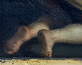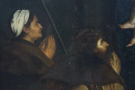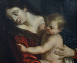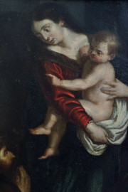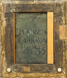 Da Michelangelo Merisi detto Caravaggio (Milano, 1571 - Porto Ercole, 1610), Madonna dei pellegrini, olio su rame, cm 26x20, entro cornice, (lievi difetti)
