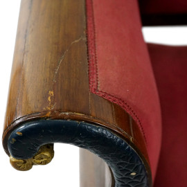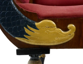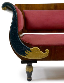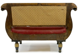 Divanetto Impero del XIX secolo, seduta e schienale rivestiti in tappezzeria rossa, particolari scolpiti, laccati e dorati a foggia di animali marini, cm h 89x132x61, (difetti).