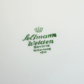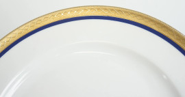 Dodici piattini da dolce in porcellana bianca con profili dorati e blu cobalto, manifattura Seltmann Weiden, Bavaria, XX secolo, diam.cm 19.