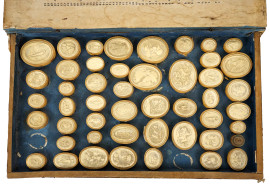Scatola apribile a libro con indice a stampa dei soggetti raffigurati nei 48 calchi in gesso.
