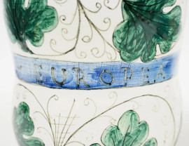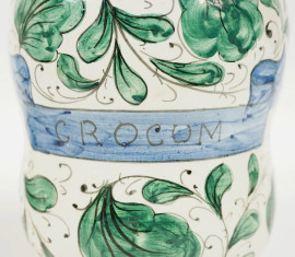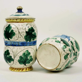 Due albarelli da farmacia con coperchi in maiolica smaltata policroma, corpi con decori a motivi fitomorfi, cm h 27,5, XX secolo, (difetti e restauri).