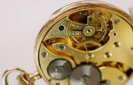 Eccelso, Orologio da tasca in oro 12 kt, quadrante circolare a numeri arabi, diam. cm 4,5, (meccanismo da revisionare)