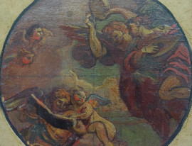 Eugenio Cisterna (1862-1933) attr.a, Santi con cherubini e putti alati, tre bozzetti ad assetto tondo dipinti a tecnica mista su cartone, cm 11,5x32, entro cornice.