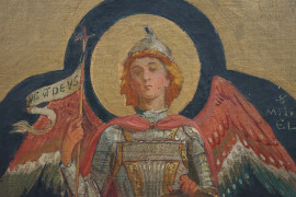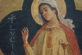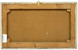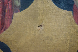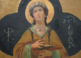 Eugenio Cisterna (1862-1933) attr.a, Sei santi/e con attributi entro losanghe quadrilobate, bozzetto ad olio su tela per gli affreschi della Cattedrale di Ferentino, cm 30,5x50, entro cornice, (difetti sulla tela).