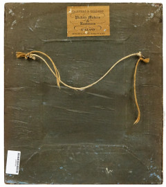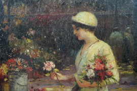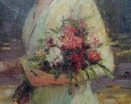 Fanciulla con mazzo di rose, olio su tela, cm 25,5x20, inizi XX secolo, entro cornice.