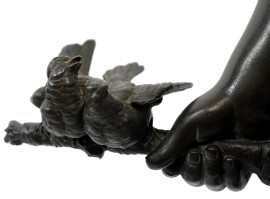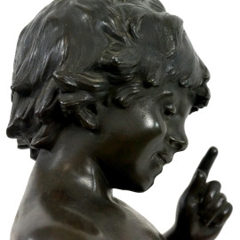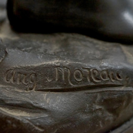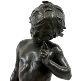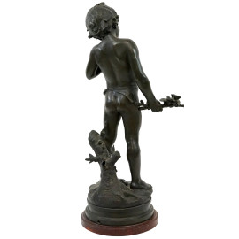 Fanciullo con coppia di colombe, scultura in bronzo brunito, cm h 78, firmato Aug. Moreau, base circolare in marmo.