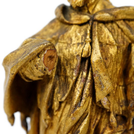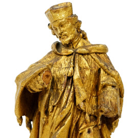 Figura di ecclesiastico, scultura in legno dorato e laccato, cm h 34.5, arte barocca italiana, XVIII secolo, (difetti e mancanze)