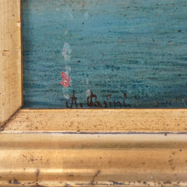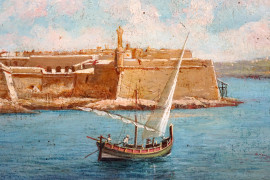 Fortezza sul mare, olio su cartone, cm 13x24, firmato, entro cornice.