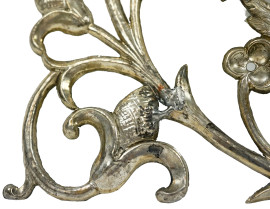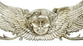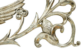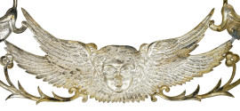 Fregio in argento fuso, sbalzato e cesellato raffigurante testa di cherubino tra tralci fioriti e ghiande, cm 23x55.5, peso gr.255, (lievi difetti).