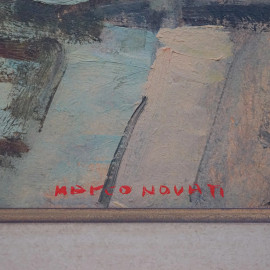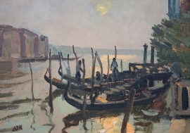 Gondole all'alba, olio su compensato, cm 34,5x43,5, firmato Marco Novati, in cornice.