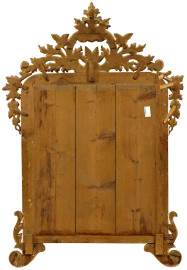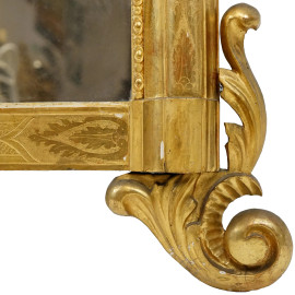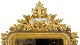 Grande specchiera in legno dorato ed intagliato, XIX secolo, cimasa intagliata a foggia di conchiglia, decori incisi e piedini a ricciolo, ingombro cm 150x97, (difetti).