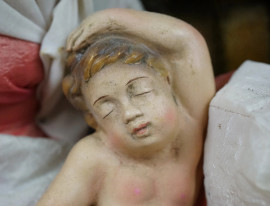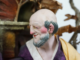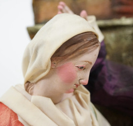 Composto da figure in legno e terracotta con vesti in raso e gallonature dorate, struttura in legno arricchita da decorazioni in paglia, muschio, foglie ed elementi naturalistici, base circolare in legno.