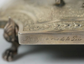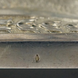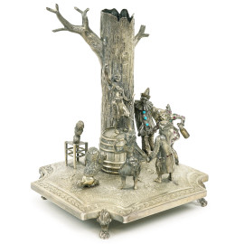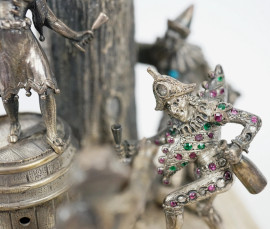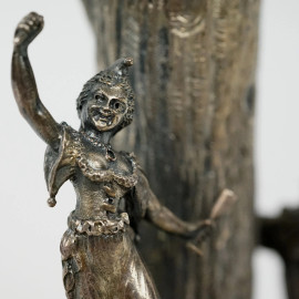 Gruppo in argento raffigurante personaggi della commedia dell'arte in festa, Eugen Cheron, Parigi, 1874-1904, cm h 16,5x13,5x13, peso lordo gr. 545