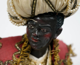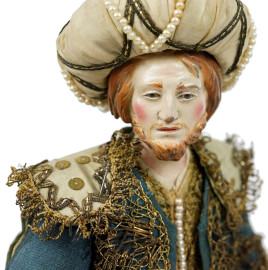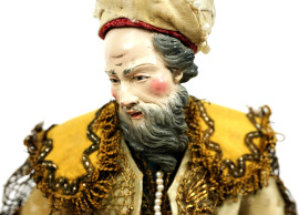 I Re Magi - Gaspare, Melchiorre e Baldassarre, gruppo di tre sculture da presepe in legno scolpito e dipinto, teste modellate in terracotta, cm h 41,5, Napoli, XX secolo. Vesti in seta e raso di colori diversi, arricchite con microperline e gallonature dorate, (difetti)