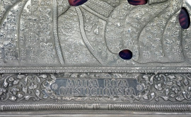 Icona raffigurante Madonna con Bambino, riza in metallo argentato con decori sbalzati, XX secolo, cm 30,5x26,5, (difetti).