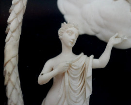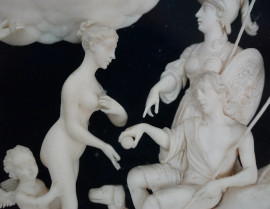 Il Giudizio di Paride, microintaglio in schiuma di mare ad assetto ovale, cm 12x9,5, XX secolo, entro cornice.